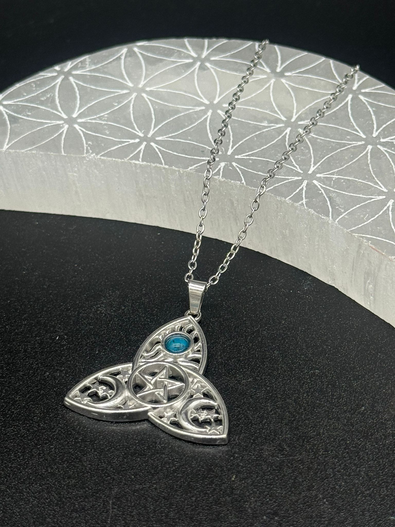 Colgante Triqueta Triple Luna en Acero con Apatita – Ciclos, Sabiduría y Comunicación Intuitiva