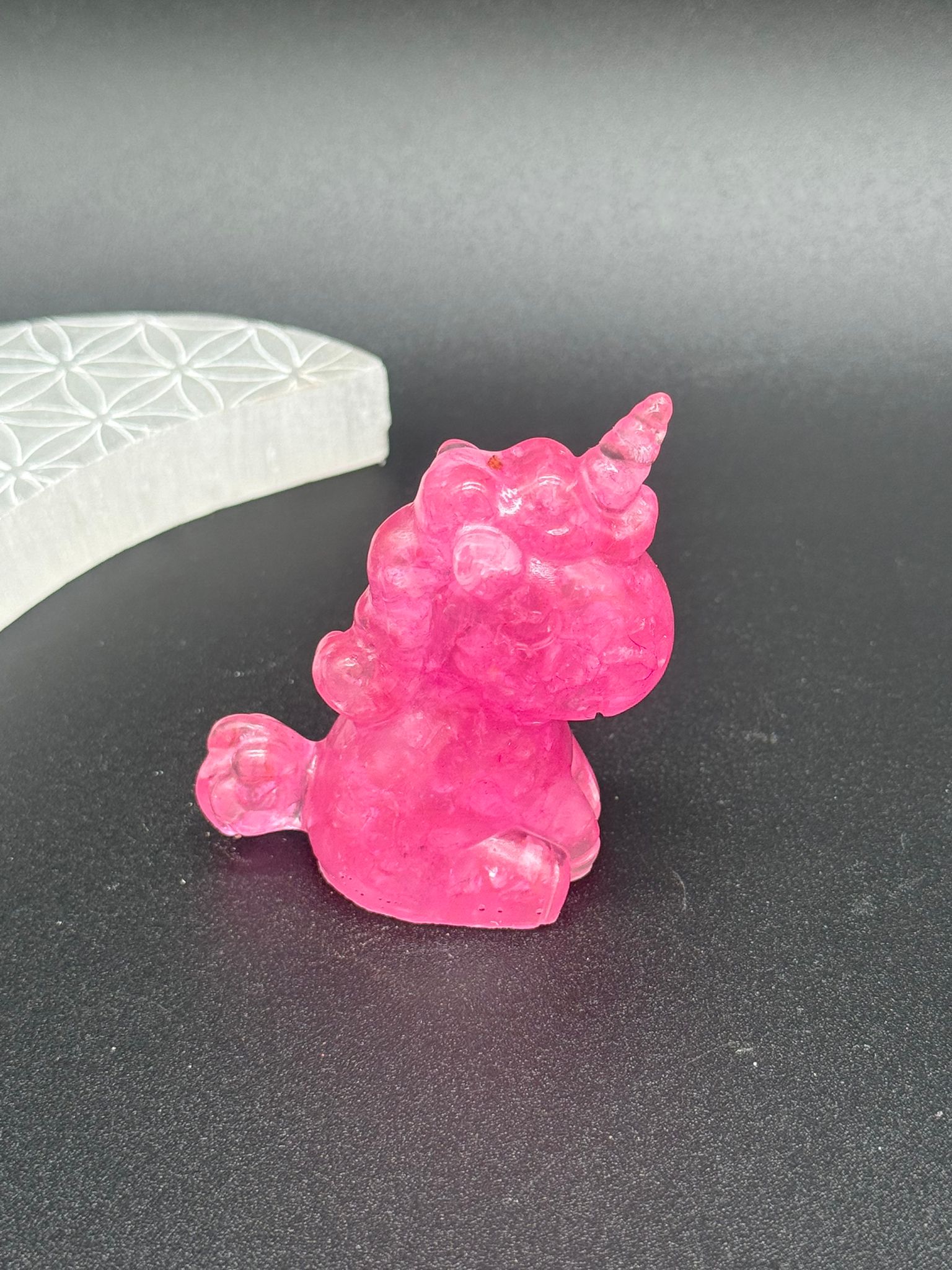 Figura artesanal de unicornio bebé de 6 cm elaborada en orgonita con incrustaciones de cuarzo rosa. Esta pieza transmite energía amorosa, calma y armonía, ideal para quienes buscan fortalecer el amor propio, las relaciones y la sanación emocional.