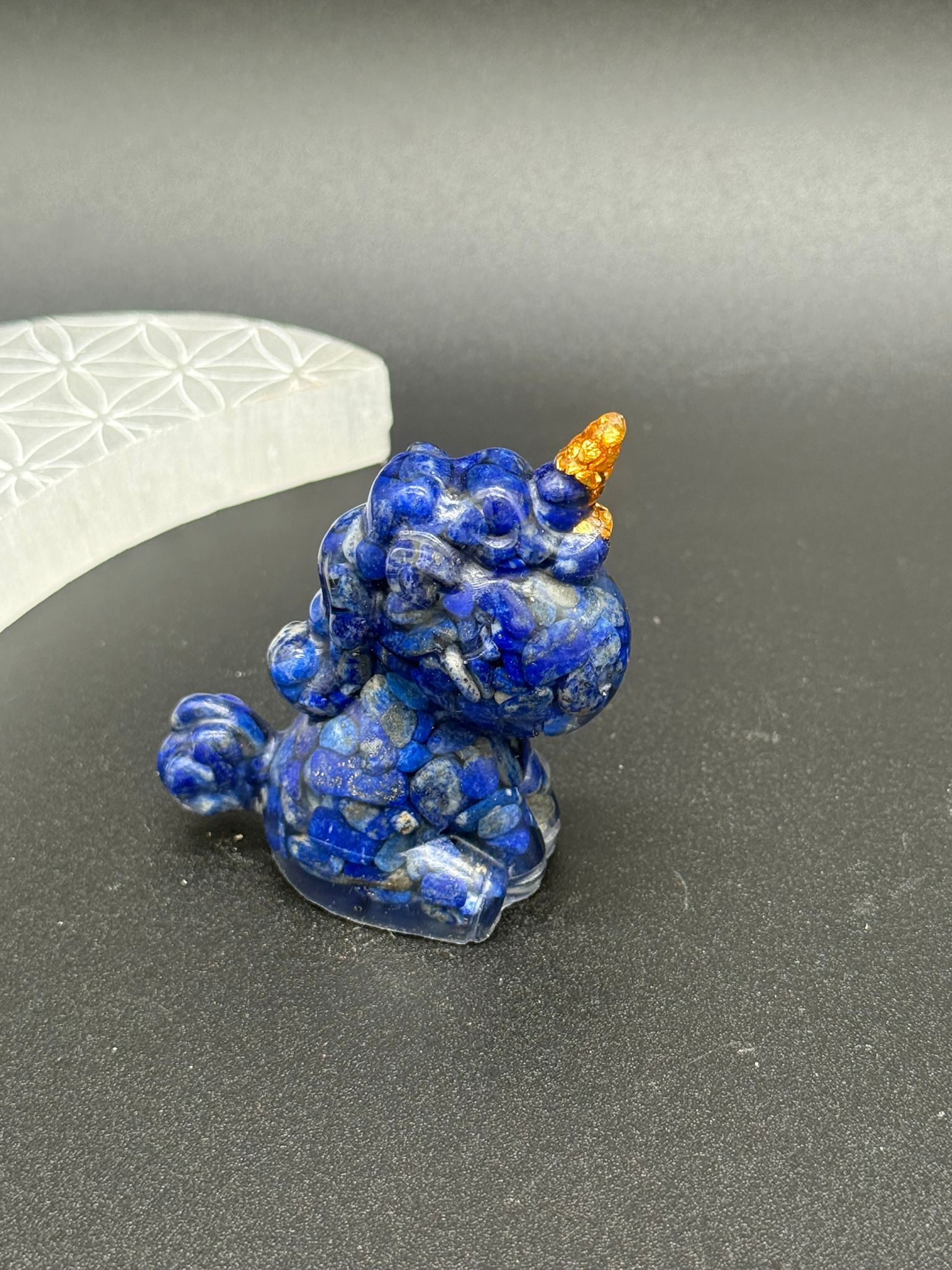 Figura artesanal realizada en orgonita con incrustaciones de lapislázuli, diseñada para armonizar el entorno y fortalecer la conexión con la verdad interior. Este unicornio bebé representa una energía protectora, sabia y profundamente espiritual.
