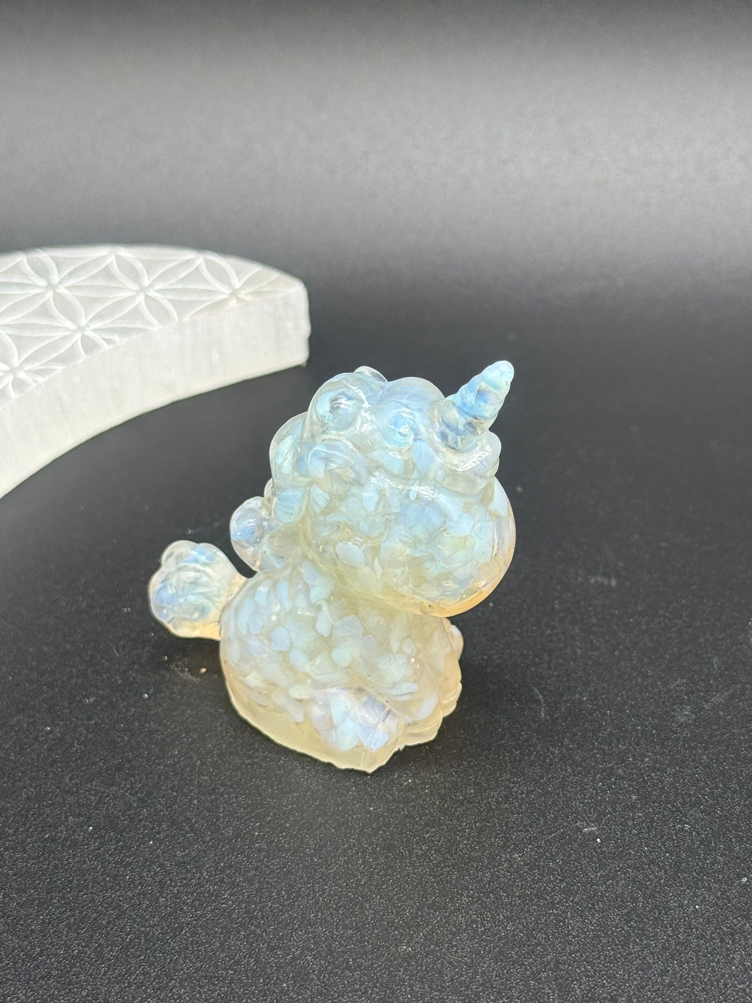 Figura elaborada artesanalmente en orgonita, con incrustaciones de opalina. Este unicornio bebé es una pieza sutil y luminosa, ideal para atraer paz, armonía emocional y energía positiva al entorno. Su presencia delicada la convierte en una herramienta energética y decorativa al mismo tiempo.