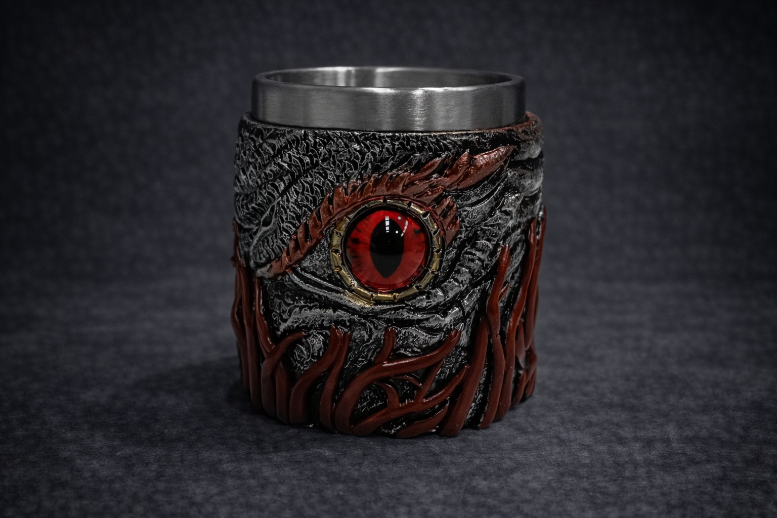 Vasito decorativo de estilo gótico con diseño central de ojo místico en relieve, rodeado de texturas oscuras que evocan escamas y llamas en tonos rojizos. El intenso color rojo del ojo, con pupila vertical, aporta un efecto visual impactante que simboliza vigilancia, poder y protección espiritual.
