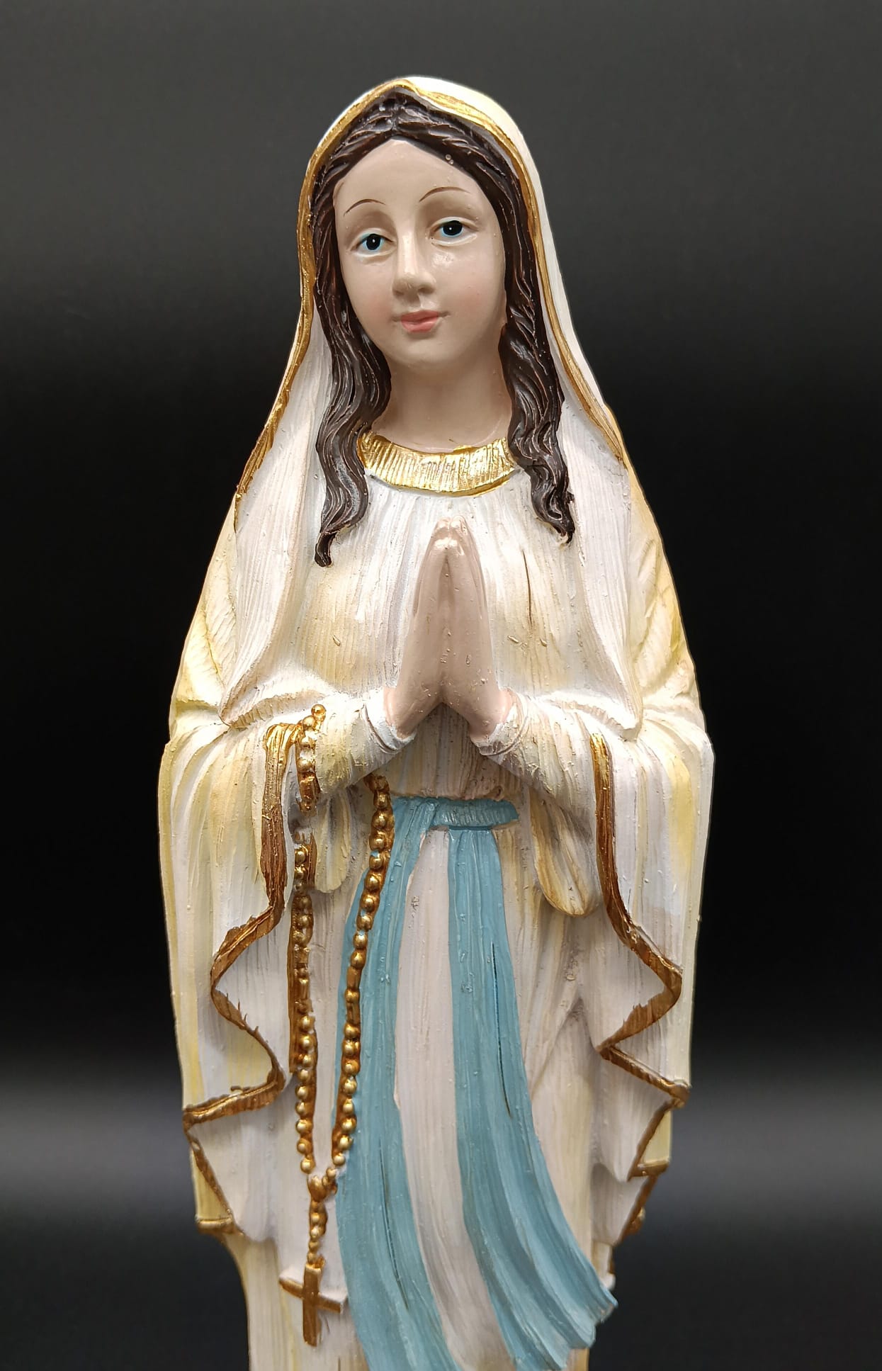 Esta figura de la Virgen de Lourdes representa un profundo símbolo de fe, humildad y esperanza, inspirado en las apariciones marianas que transmiten un mensaje de amor, oración y confianza en lo divino. Su mirada elevada y su postura de recogimiento invitan a la devoción sincera y a la apertura espiritual.