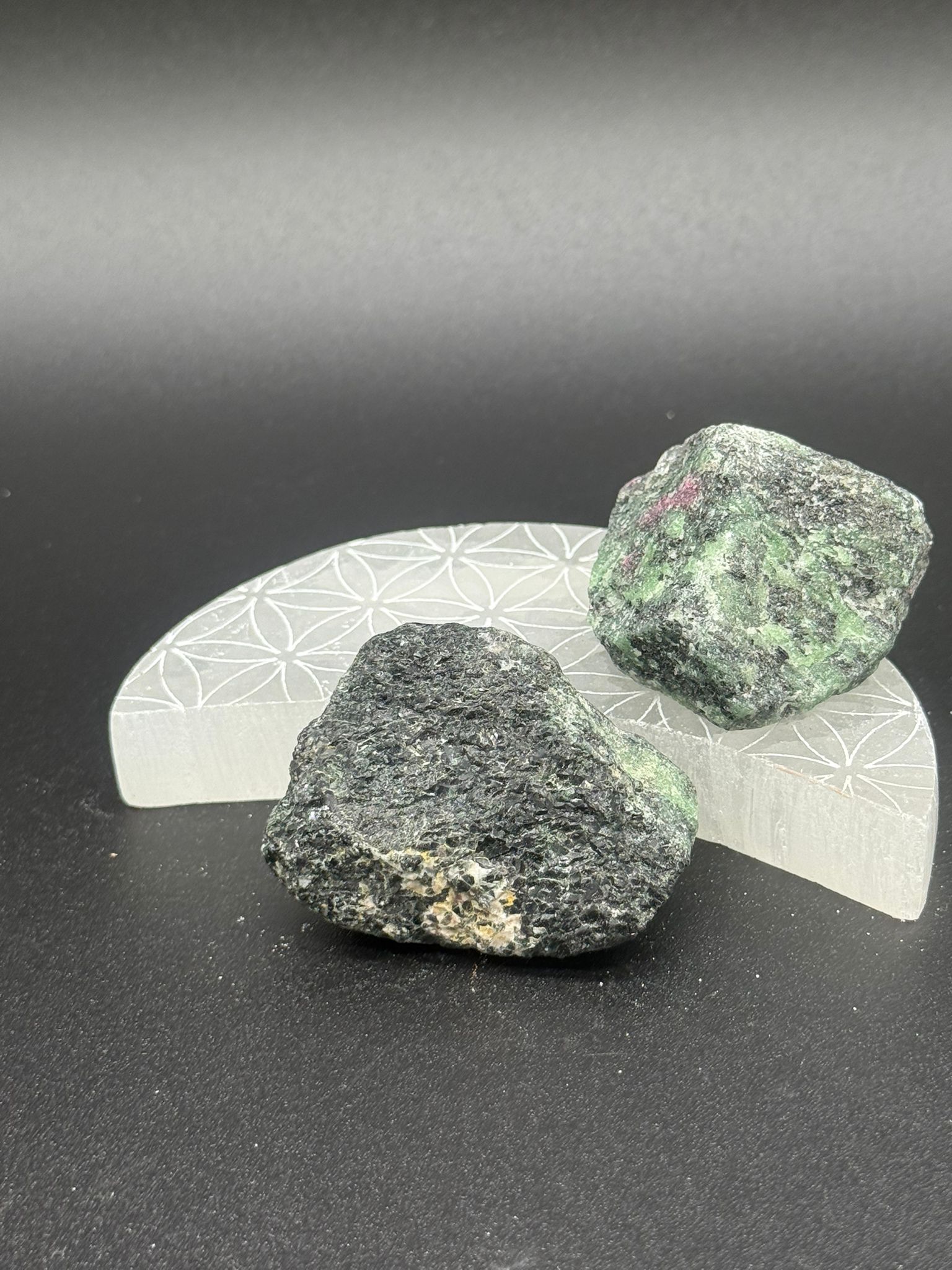 La zoisita aporta crecimiento, sanación y expansión de la conciencia, trabajando sobre el chakra corazón para fomentar la compasión, el amor y la armonía. Por su parte, el rubí activa el chakra raíz, estimulando la pasión, el coraje y la conexión con la tierra, dando fuerza para avanzar con determinación.